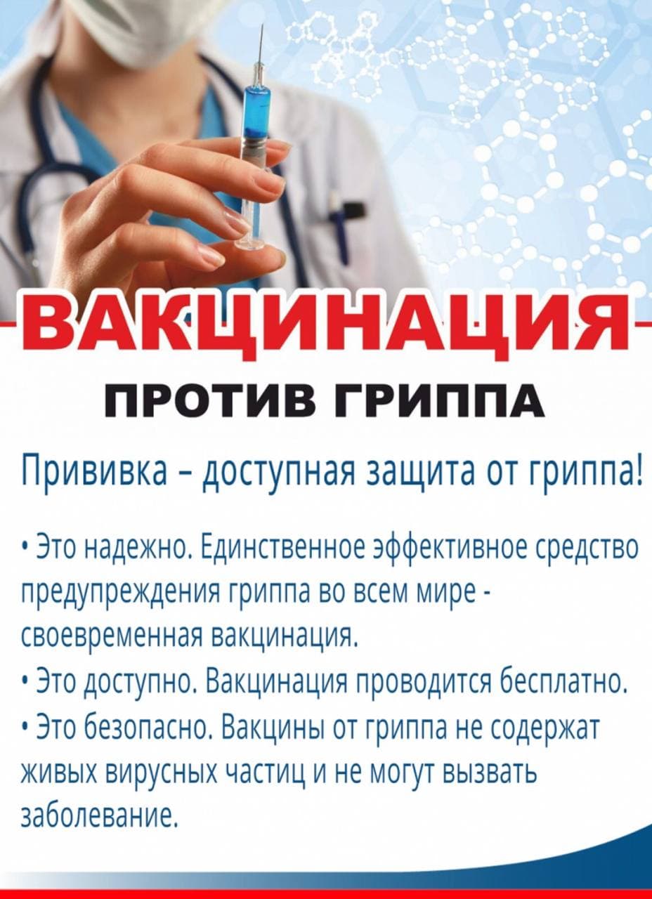 vУважаемые родители! В детских садах и школах организована вакцинация от гриппа детей и подростков. График вакцинации составлен в каждом образовательном учреждении нашего города. Для его уточнения Вы можете обратиться к классному руководителю или воспитателю той образовательной организации, которую посещает ваш ребенок. В случае временного медицинского отвода по состоянию здоровья вашего ребенка школьный медик проводит осмотр и включает вашего ребенка в график вакцинации в удобное для вас время. Для детей на семейном обучении профилактическую прививку можно поставить в прививочном кабинете детской поликлиники после осмотра педиатра в дни здорового приема.